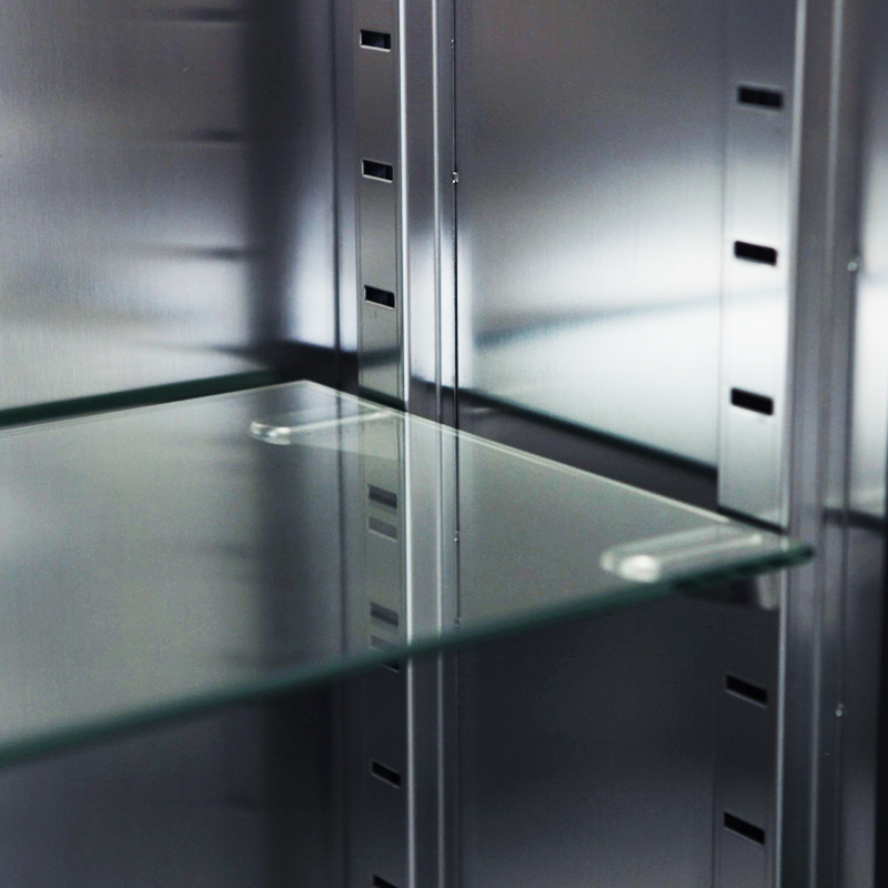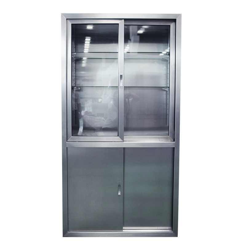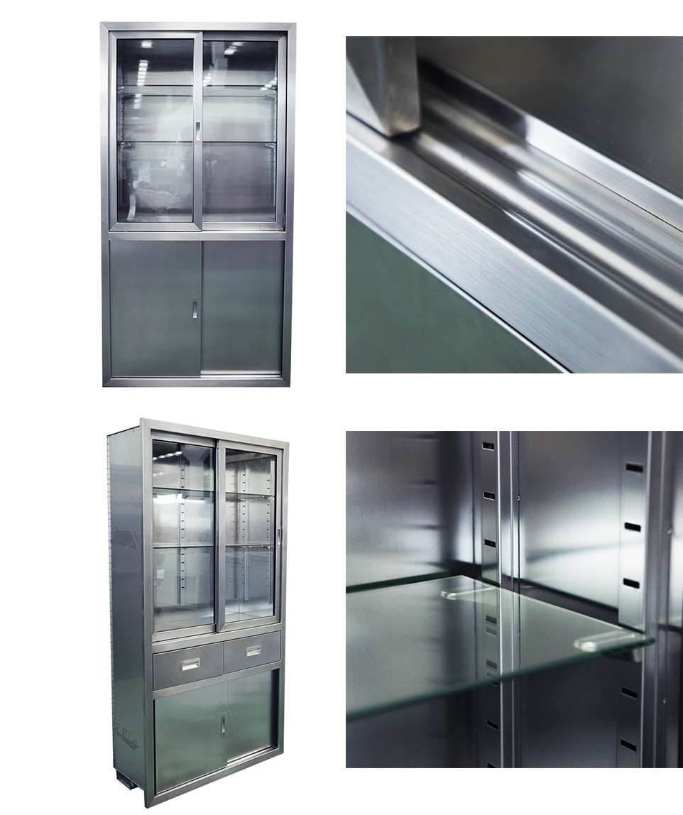 廠,實驗室等各種小型器械的保管和存放,采用sus304不銹鋼板制作,上層為玻璃門,柜體內部為圓弧造型,無死角易于清潔。